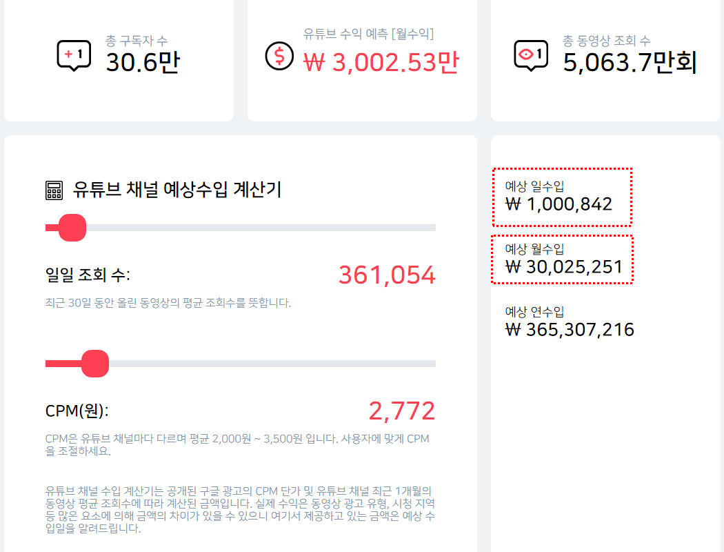 구독자와 일 조회수를 평가하여 유튜브 수익계산기로 산출 되어 보여주는게 맞는것 같아요