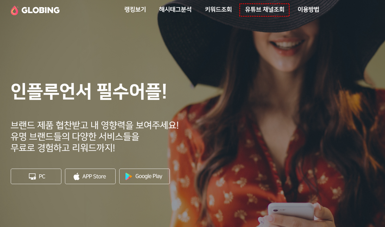 글로빙에 접속하신후 사용하시는 기기에 맞추어 어플을 설치 하시면 되며 일반 pc라면 상단 유튜브 채널조회로 이동해주세요